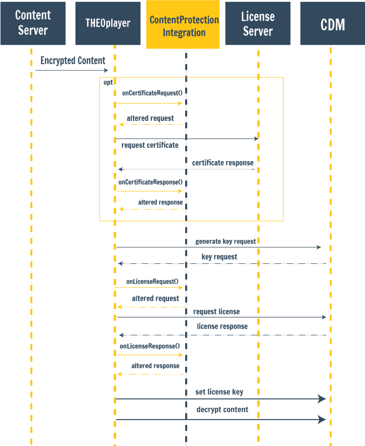 THEOplayer supports Fairplay, PlayReady and Widevine by default. In many cases however, developers are working with a multi-DRM vendor that requires a tailored integration approach. THEOplayer already includes a large number of pre-integrated solutions through partnerships with multi-DRM vendors. In addition, because there is no one-fits-all approach, an API is available that allows you to build custom DRM integrations. It gives the possibility to alter the DRM process by hooking into key points of the DRM flow, such as right before creating certificate and license request bodies, or right after receiving the responses.