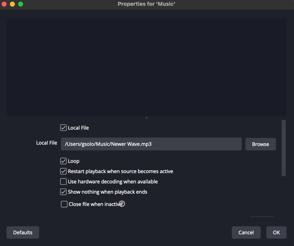 We can also add in some audio as a part of this automation. First, lets add a media source into our scene with some royalty free music we want to play as people join the stream. This could also be a looping video if you are not using a static image in the scene. Ensure that “Loop” and “Restart playback when source becomes active” are checked to ensure that the music doesn’t fully stop until you tell it to.
