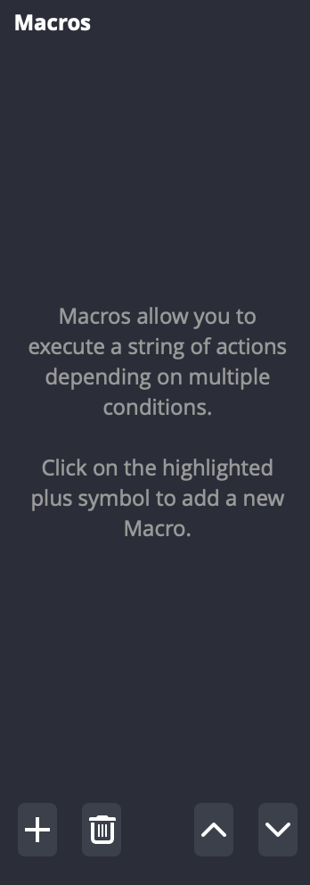 Inside the Macro tab, we have a few different panels to work with. To begin, lets add a new macro by clicking the “+” under the left “Macros” panel and name it what you want. In this case, I named it “Starting stream”